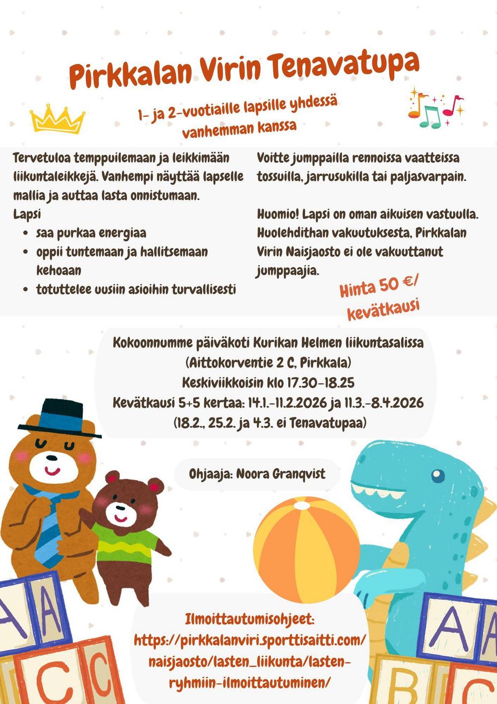 Kurikan Helmen liikuntasalissa keskiviikkoisin klo 17:30-18:25. Kevätkausi 5 + 5 kertaa 14.1.-11.2.2026 ja 11.3.-8.4. (18.2., 25.2. ja 4.3. ei Tenavatupaa). Ohjaaja Noora Granqvist.